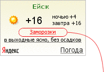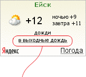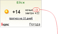 Резкие похолодания ночью![]() Если ночью существенно холоднее, чем днем, ночная температура выделяется красным цветом. | Затяжные дожди![]() О затяжных дождях в Ейске информер предупреждает соответствующей надписью – «дожди». |