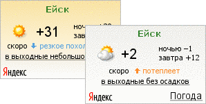 Информер метеочувствителенЕго цвет меняется вместе с погодой в Ейске – от морозно-синего до солнечно-песочного.![]() | Погода на выходные в Ейске![]() Пятничный информер помогает планировать отдых. Он показывает прогноз погоды в Ейске на ближайшие выходные - облачно или ясно, будут ли осадки. |